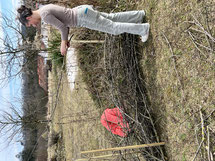 wir haben 4 Pfähle eingeschlagen, da schlichten wir das Füllmaterial aus Ästen, Zweigen von unseren Laubbäumen (Streuobstäumen), die bei Baumschnittabeiten anfallen rein. Das ist besonders gut geeignet, da es langsam verrottet und somit länger als Nährstoffquelle und Lebensraum für Insekten und Kleintiere dient: