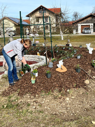 1 Zwerg-Apfelbeere Aronia melanocarpa 'Viking', 1 KÄTZCHENWEIDE Salix Caprea Pendula, 1x EDELGINSTER Cytisus Lena, 1x Kokardenblume 'Arizona Sun', Gold-Schafgarbe Achillea filipendulina 'Cloth of Gold', Hornveilchen, Traubenhyazinten Muscari armeniacum (gewusst: Spargelartige Gewächse?) , Immergrün vinca minor, Narzissen, Tulpen, heimische Blühsamenmischung...
