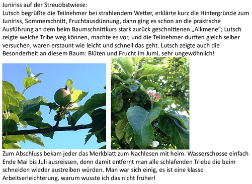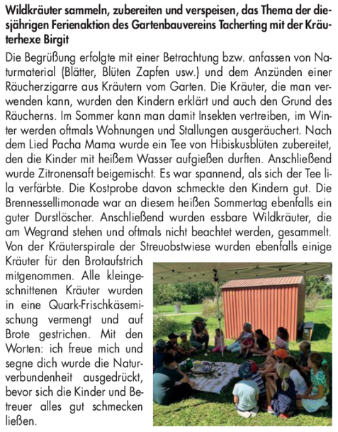 Riesenbärenklau RBK ist phototoxisch das bedeutet man wird lichtempfindlich sobald man sich ihm nähert und bekommt Hautverletzungen. Natürlich Löwenzahn, Gundermann, erfuhren dass aus Brennnesseln Eiweißpulver gemacht wird oder sogar Biowaschmittel aus Ross-Kastanien, probierten frische Blätter wie von Rosengewächsen (Apfelbaum), Weißdorn, Buche, erfuhren, daß Rotbuche eine Woche beim Austrieb super schmeckt uvm. Auf der großen Kräuterschnecke sind Küchenkräuter angesetzt wie: Liebstöckel, Rosmarin, Melisse und teils mit Schildern gekennzeichnet. Beschreibungen der Bäume per QR-Code via Handy abrufbar
