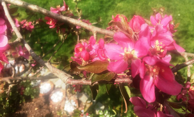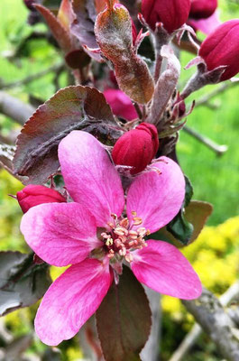 Sie hat dekorative rötliche Blätter und im Frühjahr rote Blüten.